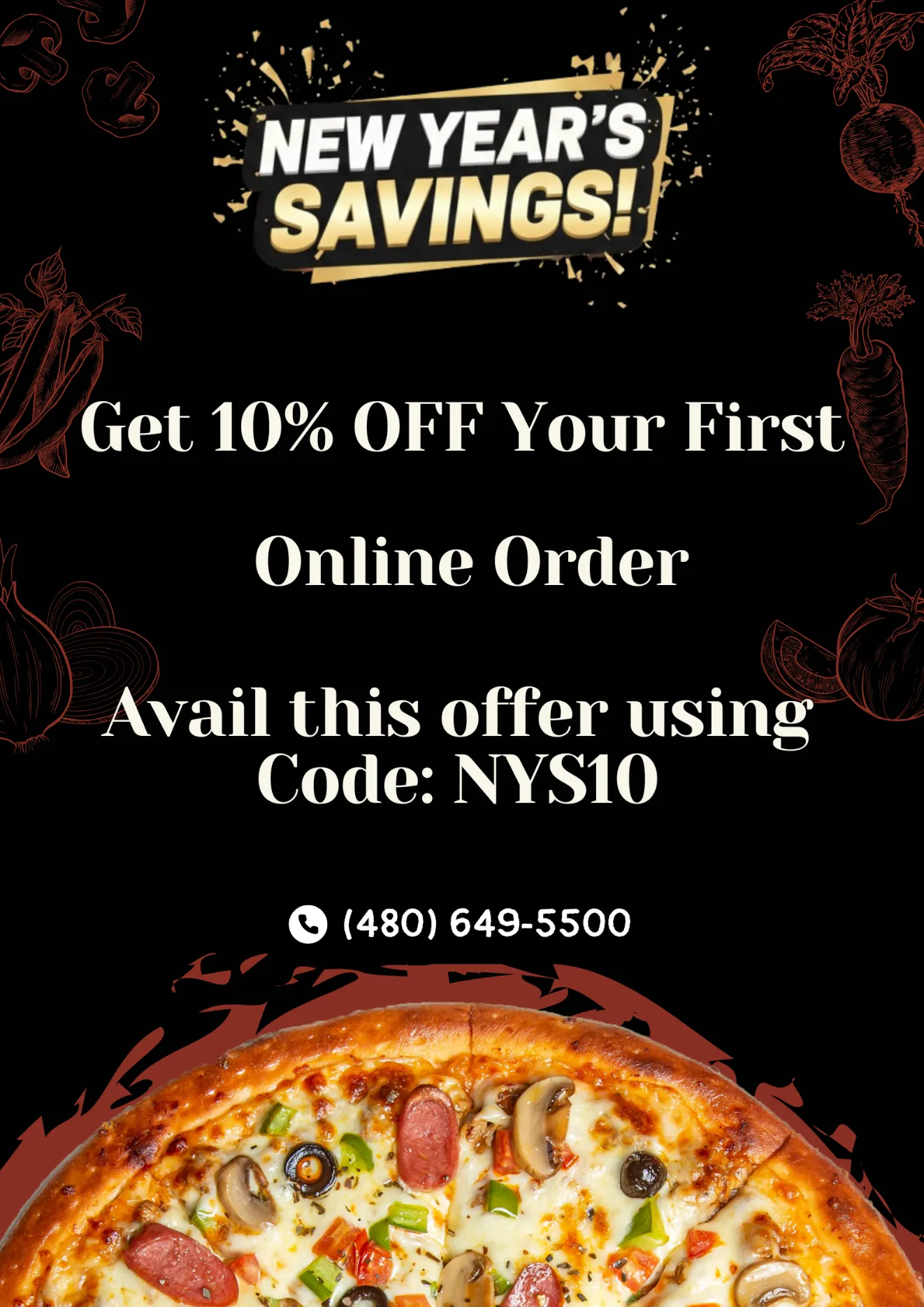 Great service & delicious pizza, made with fresh ingredients. Even our pizzas dough is made fresh daily! Try our Calzones, Pasta, Salads, Wings, or Gyros! Order online for delivery or carry-out, or visit us on the corner of Alma School Road & 8th Avenue in Mesa, AZ.